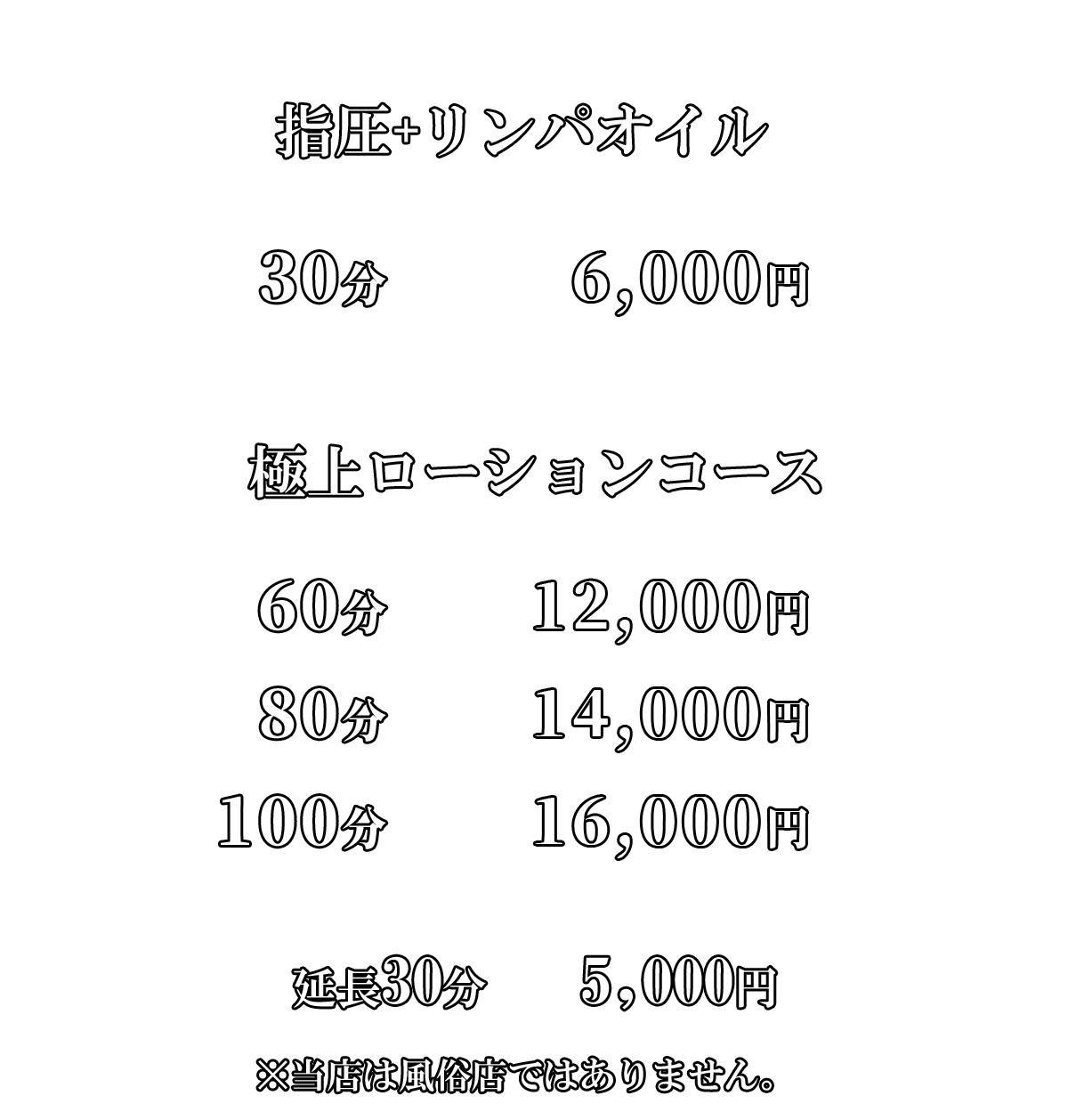 当店では、アロマオイルの効能と当店自慢のセラピストによるリンパマッサージの相乗効果による、癒しのひとときをお客様お一人お一人にお届けしております、自然で心やすらぐ優美な香りを、施術中はもちろんご帰宅お休みになってから翌日朝目覚めでまで楽しんで頂けます、どうぞゆっくりご堪能ください。